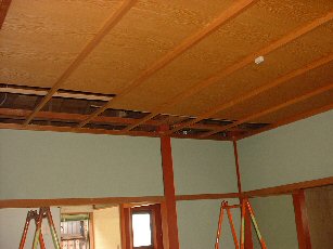 ![]() 1階の工事中です。 工事前は、ガレージでした。 床には9cm角の大引き、4.5cm角の 根太、捨張りの12mmのベニヤ板、そして |