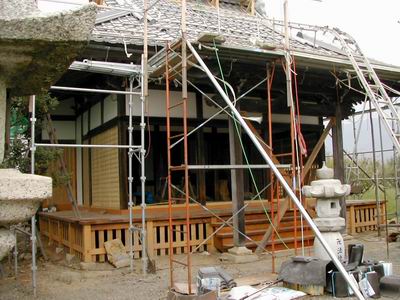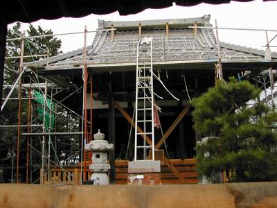 | 大澤の住民みんなで管理している地蔵院は、今から160年前の天保13年(1842年)に現在の本堂が再建され、その後大正5年(1916年)に大修理が行われていますが、近年建物の傷みがひどくなってきたため、昨年度の区総会の承認に基づき、今年の6月から68年ぶりの修理工事に取りかかっています。 建物の基礎を補強し、全体のゆがみを直すとともに、屋根の瓦も葺き替え、建具や畳も取り替えて、11月には工事が終わる予定となっています。この修理工事に伴って、屋根の鬼瓦から、大正7年に彦根の鬼瓦師が作成し、平柳の窯で焼かれたことや、同じ時期に屋根などの工事をした記録が見つかりました。 今年の11月17日の「土と文化のまつり」の日には、地蔵院修理工事の落慶 法要が営まれることになっています。なお、今年の7月、地蔵院は文化庁から「有形登録文化財」に指定されました。これは、地域の景観にふさわしい、伝統のある建物として認められたためです。 |